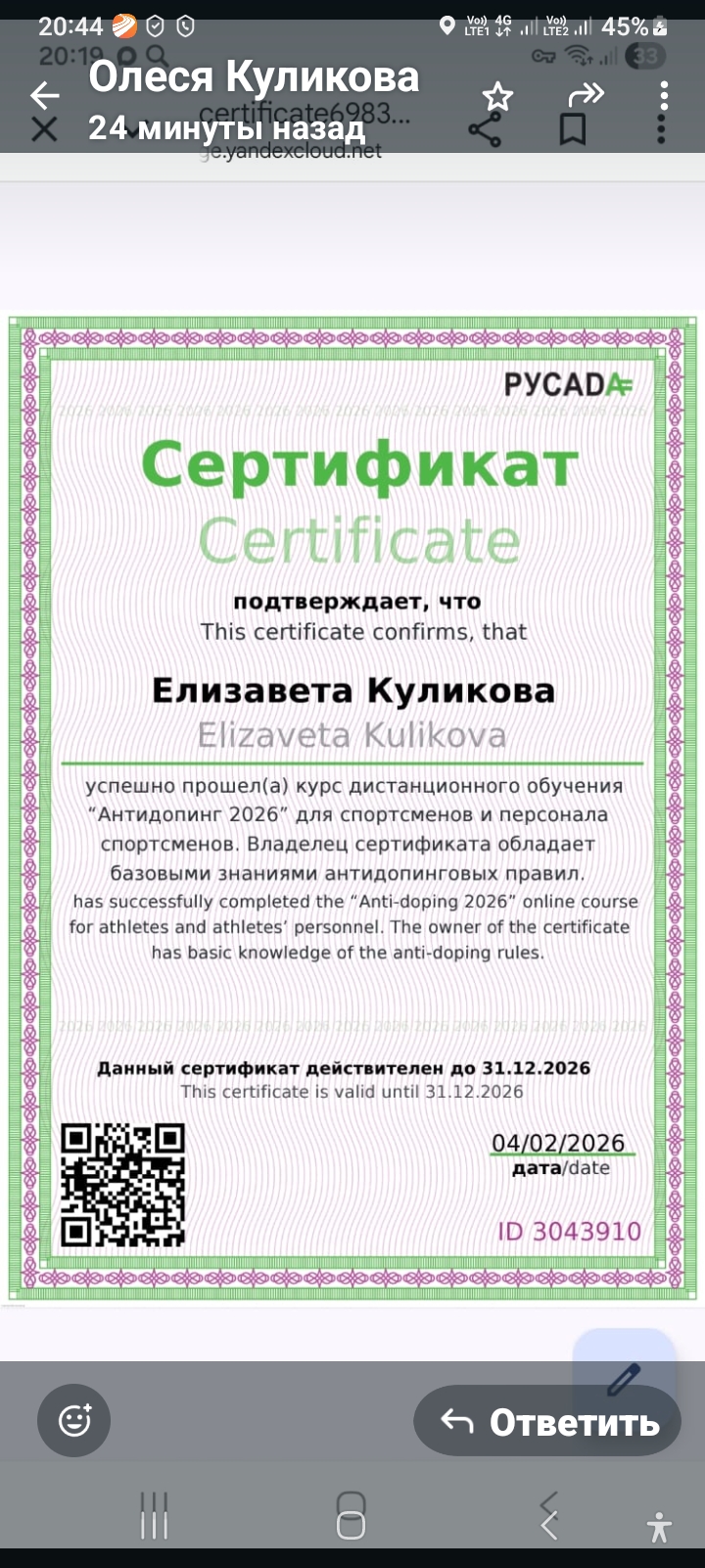 Звание/разряд: